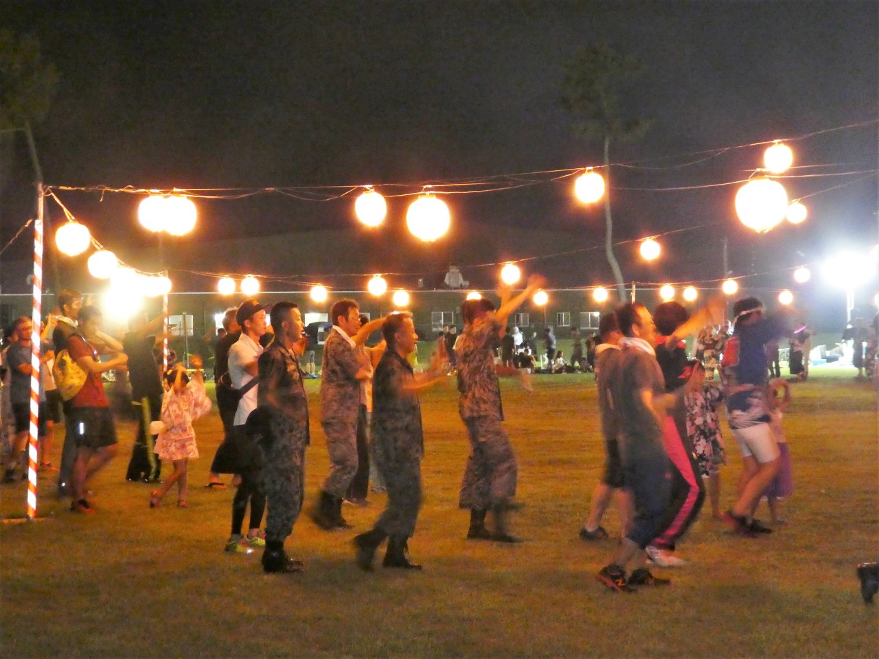 7月19日 美保基地納涼祭に参加しました 2017年7月20日実績-渡ことぶきクラブことぶきクラブ管理者 予定より少人数での参加にまりました 例年に比べて陽が落ちるのが遅かったようだ 到着した時にはすでに他地区の踊りが始まっていた とても大勢の参加者だった 来年は少し多くの参加者と一緒に参加したいものだ 炭坑節はまだよかったが 鬼太郎音頭はやはり難しい 練習が必要だ!