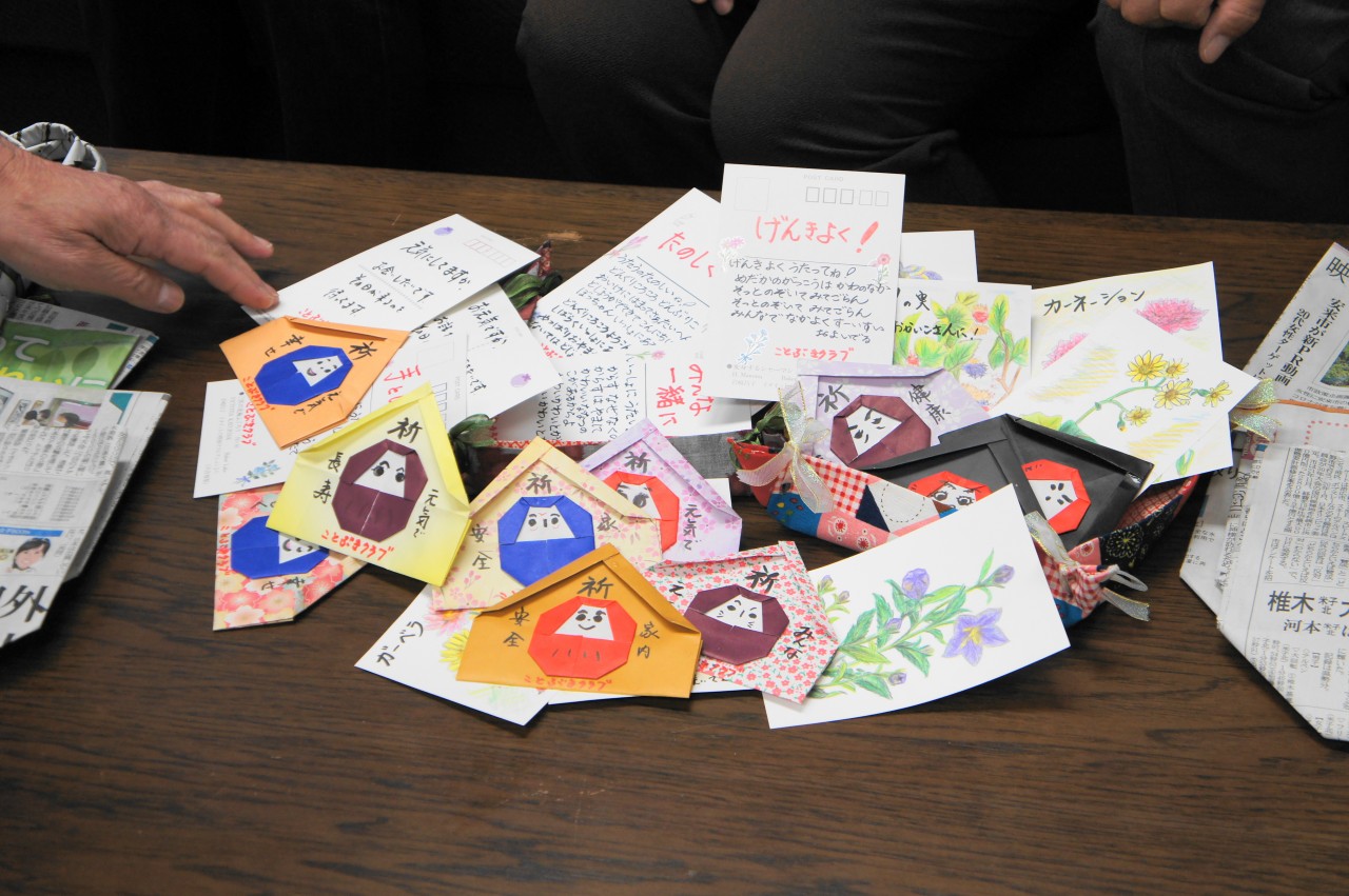 何かでメンバーの心を伝えたいと手作り作品を届けることにしました。童謡歌詞を記した絵はがき、塗り絵はがきにメッセージ、折り紙「だるまの絵馬」を古布のプレートに入れて、新聞紙の再利用バックも添えました。声を合わせて歌う童謡は、お話を聞く以上に入所者さんは満足を得られます。お花の塗り絵、健康祈願の絵馬など、手作り作品が傾聴委員会メンバーの心を届けてくれるといいですね。