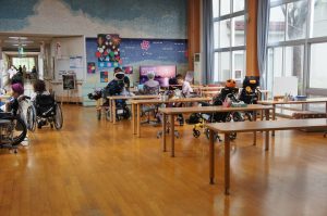 ここでの日中生活介護と終日入所支援者の定員はそれぞれ70名、ショートステイの定員が5名だそうですが、その他一時支援も有るとの事。ここでお世話されるのは重度の障がいがある方ばかり。多くの職員の方が入浴、排せつ、食事等の介助等ばかりではなく、「生きたい道に近づける」ことを目指し各種サポートを行っておられることを考えると、この施設のありがたさを感じました。